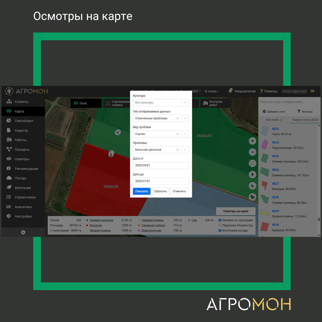 В АгроМон появилась возможность быстро и наглядно анализировать результаты осмотров прямо на карте.